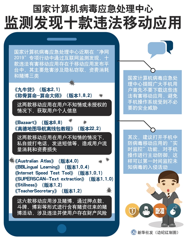 新華社天津5月28日電(記者張建新)國(guó)家計(jì)算機(jī)病毒應(yīng)急處理中心近期在“凈網(wǎng)2019”專項(xiàng)行動(dòng)中通過(guò)互聯(lián)網(wǎng)監(jiān)測(cè)發(fā)現(xiàn),十款違法有害移動(dòng)應(yīng)用存在于移動(dòng)應(yīng)用發(fā)布平臺(tái)中,其主要危害涉及隱私竊取、資費(fèi)消耗和賭博三類。