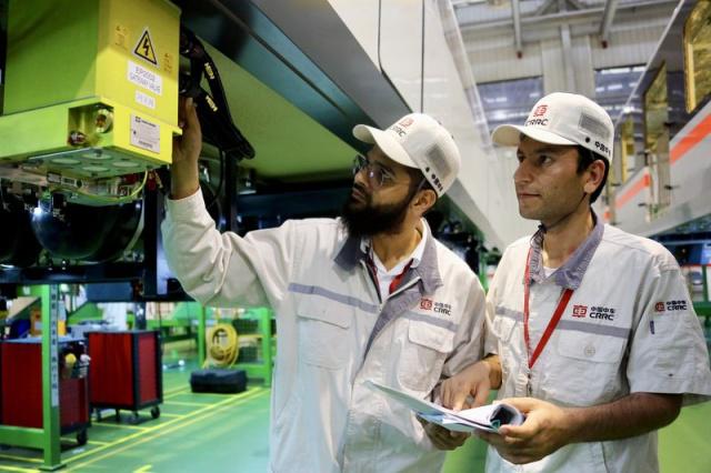 中車株機(jī)公司巴基斯坦籍員工可汗和阿哈在做機(jī)車工藝檢測(cè)。(中車株機(jī)公司李歆彧供圖)