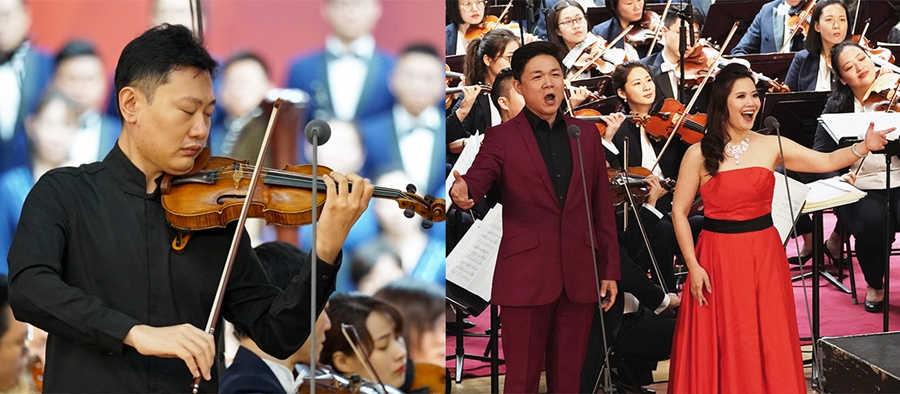 擔(dān)任《梁祝》小提琴獨(dú)奏的陳曦(上左),17歲就獲得第12屆柴可夫斯基國際音樂比賽小提琴銀獎,那屆金獎可是空缺的哦。青年男高音歌唱家王傳越(右圖左)曾獲2015年第15屆柴可夫斯基大賽銀獎,女高音歌唱家宋元明(右圖右)曾獲第48屆法國圖盧茲國際聲樂大賽第一名。