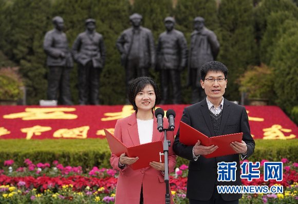 3月28日在西柏坡,記者代表在“壯麗70年·奮斗新時代”大型主題采訪活動啟動儀式上宣讀倡議。新華社記者 邢廣利 攝