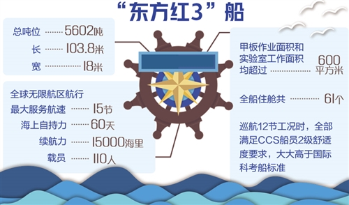 “東方紅3”船是一艘5000噸級(jí)新型深遠(yuǎn)海綜合科學(xué)考察船,以培養(yǎng)深海大洋創(chuàng)新型人才為首要任務(wù),融合科學(xué)研究、科學(xué)考察、高新技術(shù)研發(fā)應(yīng)用為一體。該船總長103.8米、寬18米,海上自持力長達(dá)60天,可連續(xù)航行1.5萬海里;載員110人,甲板作業(yè)面積和實(shí)驗(yàn)室工作面積均超過600平方米。該船是目前世界上最安靜,定員最多,經(jīng)濟(jì)性、振動(dòng)噪聲、電磁兼容等指標(biāo)要求最高,作業(yè)甲板和實(shí)驗(yàn)室面積利用率最大、綜合科考功能最完備的新一代海洋綜合科考船。