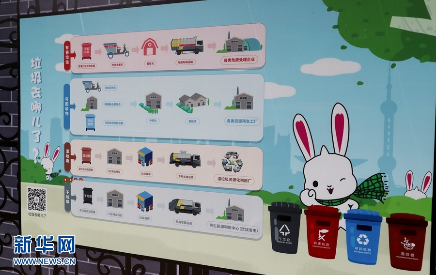 在虹口區(qū)嘉興路街道“宇泰景苑”小區(qū)內(nèi),小區(qū)垃圾房外的裝飾墻上對(duì)分類后不同垃圾的去向進(jìn)行詳解(6月24日攝)。 新華社記者 方喆 攝