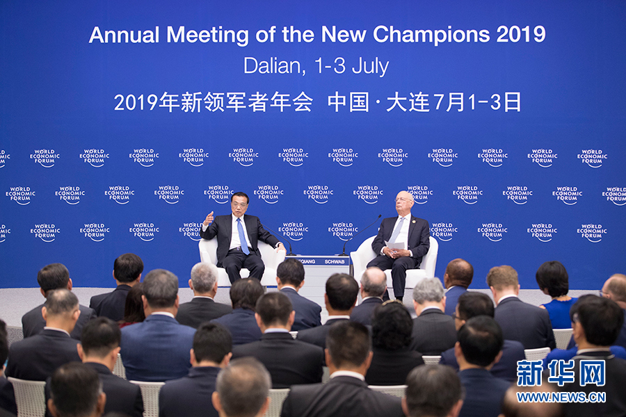 7月2日,國務院總理李克強在大連同出席2019年夏季達沃斯論壇的國際工商、金融、智庫、媒體界代表舉行對話會。 新華社記者 王曄 攝