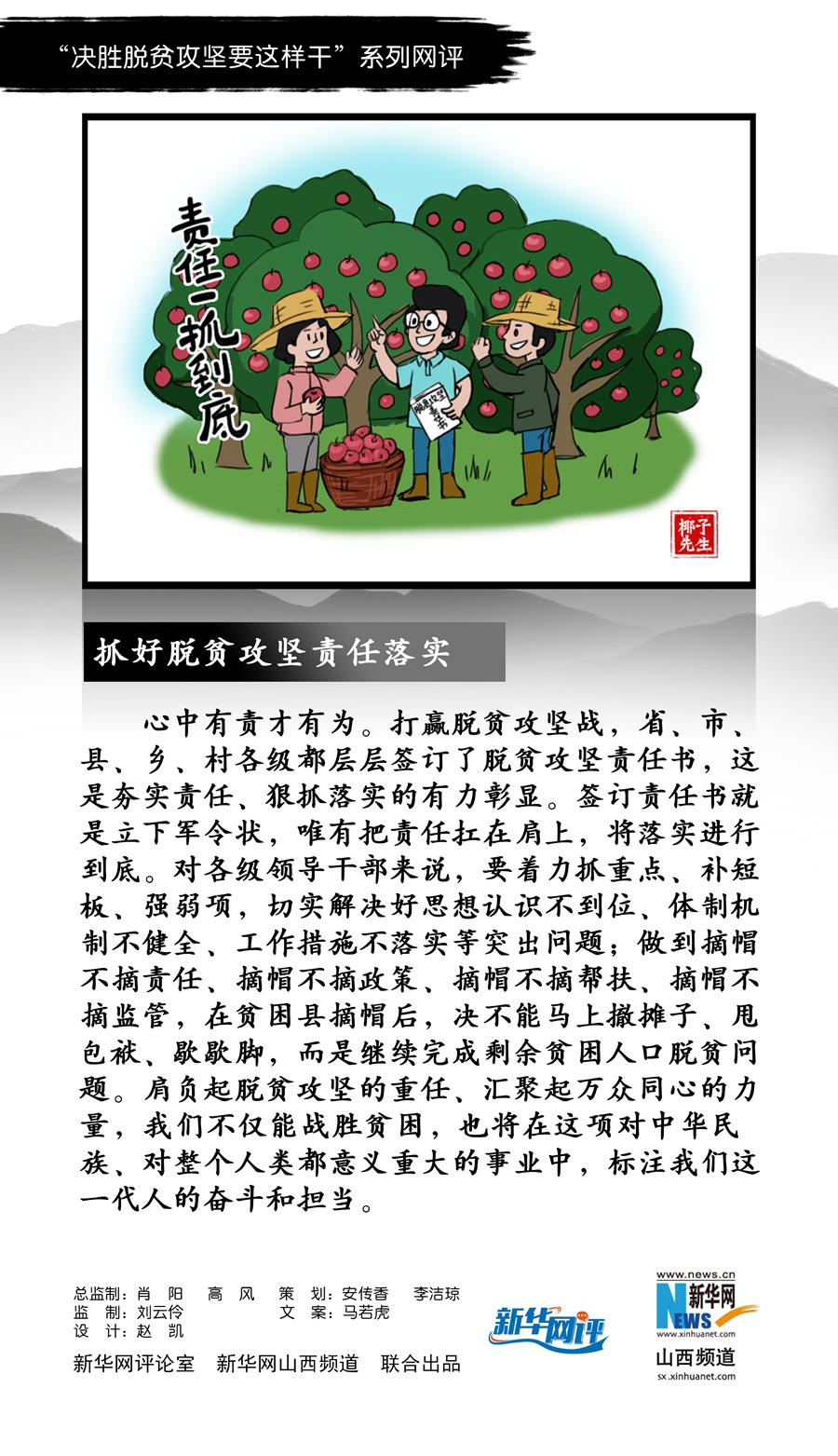 心中有責才有為。打贏脫貧攻堅戰(zhàn),省、市、縣、鄉(xiāng)、村各級都層層簽訂了脫貧攻堅責任書,這是夯實責任、狠抓落實的有力彰顯。簽訂責任書就是立下軍令狀,唯有把責任扛在肩上,將落實進行到底。對各級領導干部來說,要著力抓重點、補短板、強弱項,切實解決好思想認識不到位、體制機制不健全、工作措施不落實等突出問題;做到摘帽不摘責任、摘帽不摘政策、摘帽不摘幫扶、摘帽不摘監(jiān)管,在貧困縣摘帽后,決不能馬上撤攤子、甩包袱、歇歇腳,而是繼續(xù)完成剩余貧困人口脫貧問題。肩負起脫貧攻堅的重任、匯聚起萬眾同心的力量,我們不僅能戰(zhàn)勝貧困,也將在這項對中華民族、對整個人類都意義重大的事業(yè)中,標注我們這一代人的奮斗和擔當。(馬若虎)