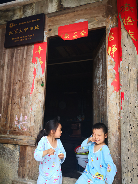 告別了土地廟,沿著紅軍街繼續(xù)東行,上一道坡來到紅軍大學(xué)遺址。這座普通的民房雖然掛著文物的標(biāo)識(shí),如今還有人家居住在此。一個(gè)4歲的小男孩和他6歲的姐姐坐在門檻上看著我們,小女孩有點(diǎn)害羞,小男孩說話干脆利落。我倆有了如下對(duì)話: