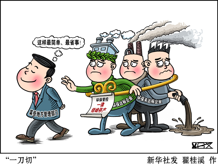 值得注意的是,有些地方“一刀切”政策開始搞移花接木。中部多家企業(yè)的相關負責人反映,遇到上級部門前來檢查、督查時,地方政府擔心指標不符合要求,就讓企業(yè)一律采取停產(chǎn)應對。可在對外發(fā)布消息時,卻說成“企業(yè)停產(chǎn)檢修”“企業(yè)升級改造設備”,本是地方的“一刀切”要求,卻搖身一變成為企業(yè)的“自行選擇”。