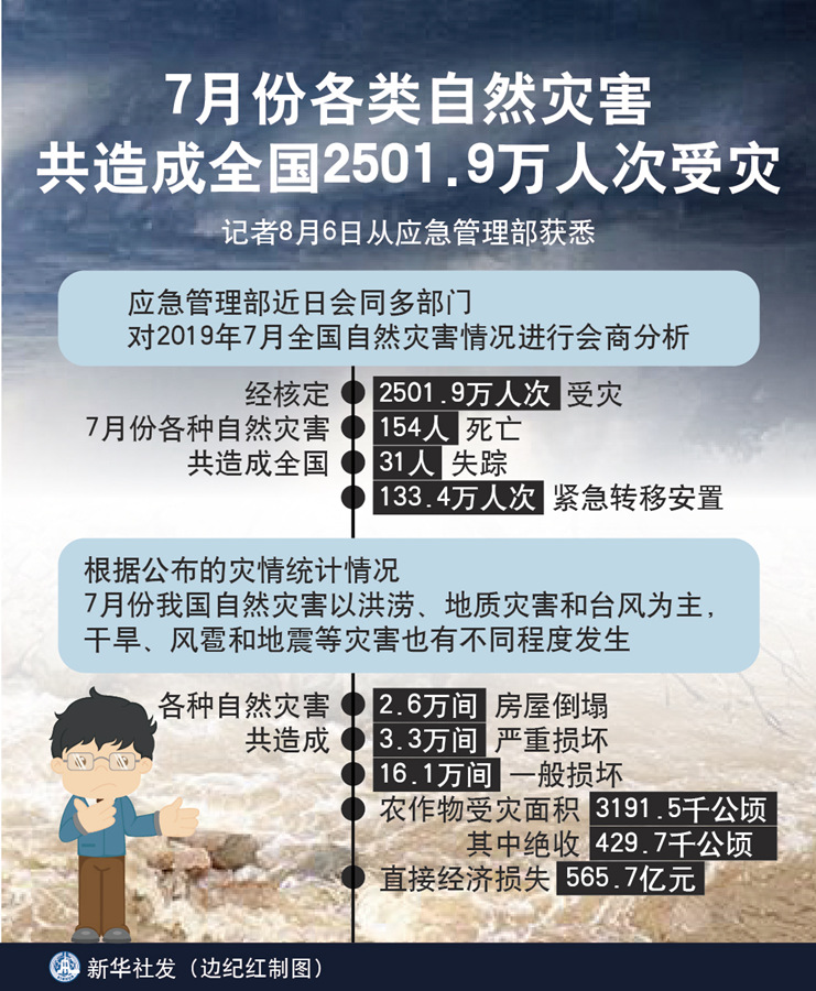 新華社北京8月6日電(記者葉昊鳴)記者6日從應(yīng)急管理部獲悉,應(yīng)急管理部近日會(huì)同多部門對(duì)2019年7月全國(guó)自然災(zāi)害情況進(jìn)行會(huì)商分析。經(jīng)核定,7月份各種自然災(zāi)害共造成全國(guó)2501.9萬(wàn)人次受災(zāi),154人死亡,31人失蹤,133.4萬(wàn)人次緊急轉(zhuǎn)移安置。