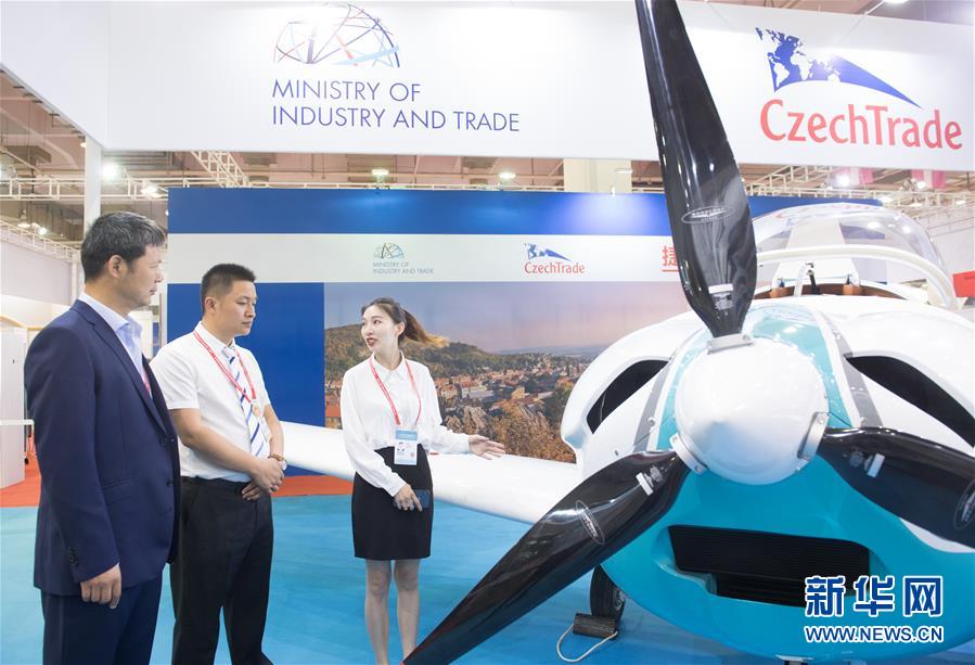 6月8日,在浙江寧波舉行的首屆中國(guó)-中東歐國(guó)家博覽會(huì)上,一名展商(右)在介紹捷克生產(chǎn)的一款輕型飛機(jī)。新華社記者 翁忻旸 攝