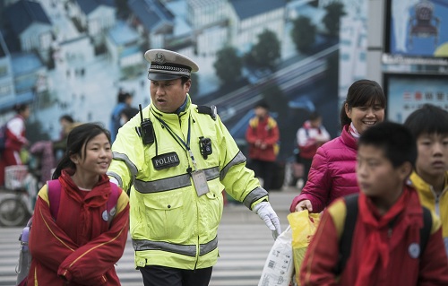 一位輔警在護送學(xué)生過馬路。陶明 攝