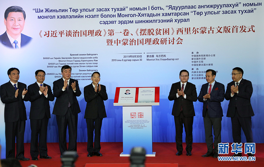 新華社烏蘭巴托8月30日電? 為慶祝中蒙建交70周年,由中國國務院新聞辦公室、蒙古國外交部、中國外文局、中國駐蒙古國大使館主辦的《習近平談治國理政》第一卷、《擺脫貧困》西里爾蒙古文版首發(fā)式暨中蒙治國理政研討會在蒙古國首都烏蘭巴托舉行。蒙古國總統巴特圖勒嘎發(fā)來賀信。中宣部副部長蔣建國、中國駐蒙古國大使邢海明,蒙古國副總理恩赫圖布辛、外交部長朝格特巴特爾、總統外事顧問特格希扎爾格勒、蒙古人民黨書記巴特恩赫等260多名代表參會。