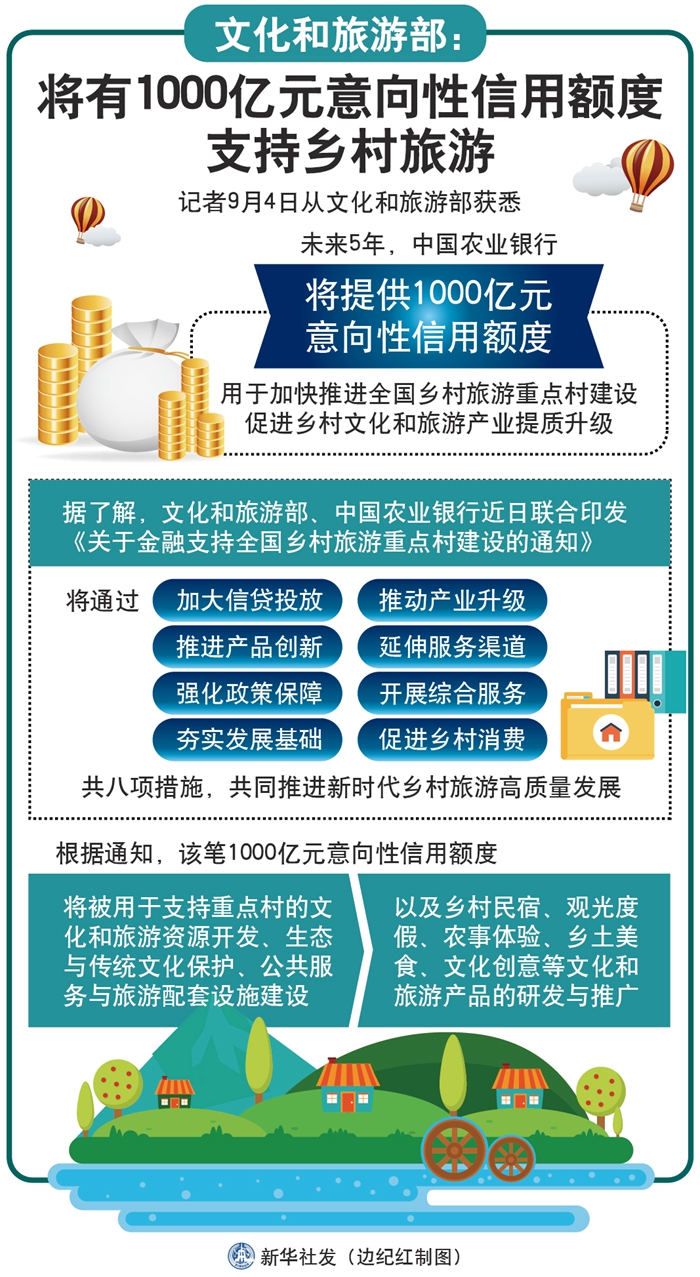 新華社北京9月4日電(記者余俊杰)記者4日從文化和旅游部獲悉,未來5年,中國農(nóng)業(yè)銀行將提供1000億元意向性信用額度,用于加快推進全國鄉(xiāng)村旅游重點村建設(shè),促進鄉(xiāng)村文化和旅游產(chǎn)業(yè)提質(zhì)升級。