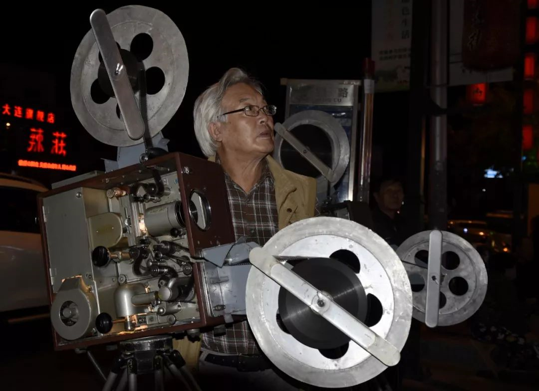 2019年10月6日,遼寧大連。大爺在商業(yè)街為市民放映老膠片電影。作者:刁丕仁