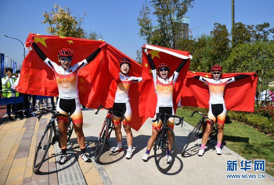 ??? 10月20日,中國隊選手趙茜沙、普譯嫻、梁洪玉和孫佳君(從右至左)慶祝奪冠。 當(dāng)日,在武漢舉行的第七屆世界軍人運動會公路自行車女子公路團(tuán)體決賽中,中國隊以4小時05分46秒的成績獲得金牌。 新華社記者李尕攝