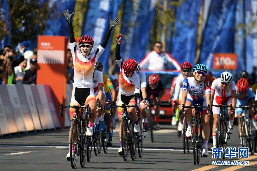 10月20日,中國隊選手趙茜沙(左)沖過終點后慶祝。 當(dāng)日,在武漢舉行的第七屆世界軍人運動會公路自行車女子公路個人決賽中,中國隊選手趙茜沙以2小時02分53秒的成績獲得冠軍。 新華社記者李尕攝