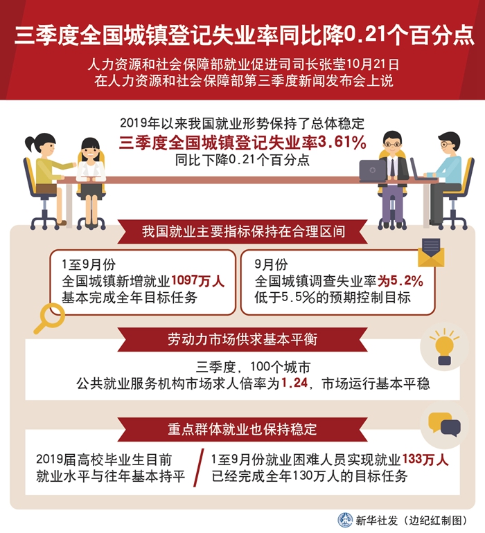 新華社北京10月21日電(記者王優(yōu)玲)人力資源和社會(huì)保障部就業(yè)促進(jìn)司司長(zhǎng)張瑩21日說,今年以來(lái)我國(guó)就業(yè)形勢(shì)保持了總體穩(wěn)定,三季度全國(guó)城鎮(zhèn)登記失業(yè)率3.61%,同比下降0.21個(gè)百分點(diǎn)。