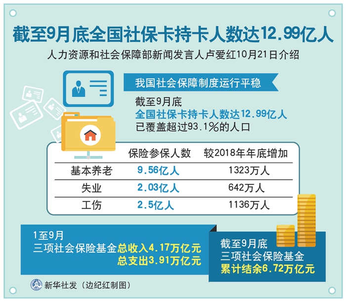 新華社北京10月21日電(記者王優(yōu)玲)人力資源和社會保障部新聞發(fā)言人盧愛紅21日介紹,我國社會保障制度運行平穩(wěn),截至9月底,全國社??ǔ挚ㄈ藬?shù)達12.99億人,已覆蓋超過93.1%的人口。