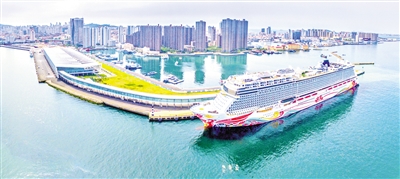一艘郵輪停靠在山東港口集團(tuán)青島國(guó)際郵輪母港。(資料照片)
