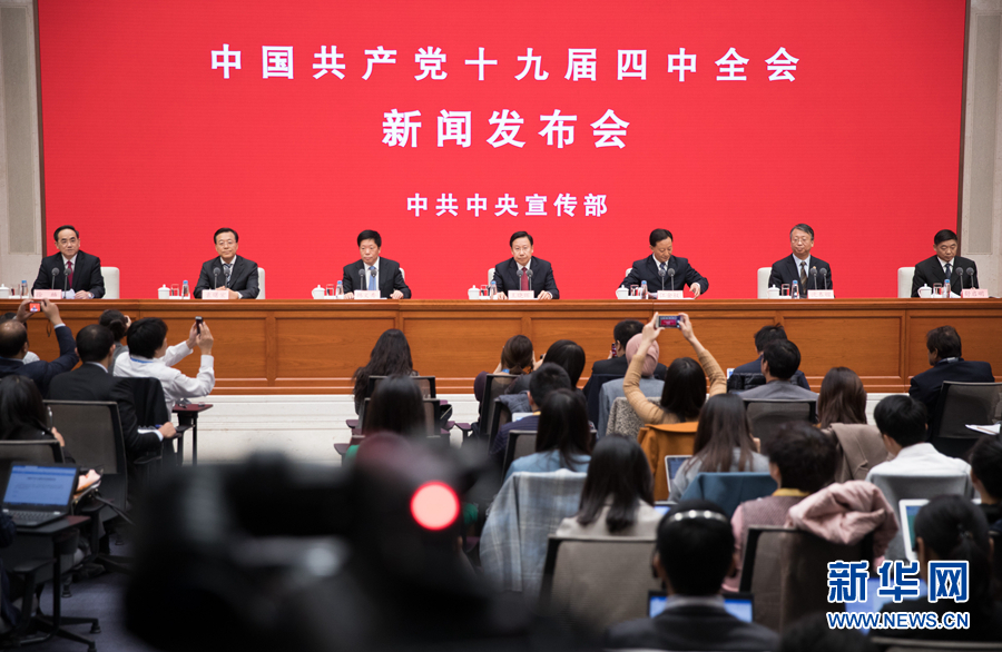 11月1日,中共中央宣傳部在北京舉行中國(guó)共產(chǎn)黨十九屆四中全會(huì)新聞發(fā)布會(huì),請(qǐng)中央宣傳部分管日常工作的副部長(zhǎng)、中央政策研究室副主任王曉暉,中央政策研究室分管日常工作的副主任江金權(quán),中央財(cái)經(jīng)委員會(huì)辦公室分管日常工作的副主任韓文秀,全國(guó)人大常委會(huì)法工委主任、港澳基本法委主任沈春耀,司法部黨組書(shū)記、副部長(zhǎng)袁曙宏,全國(guó)政協(xié)副秘書(shū)長(zhǎng)舒啟明介紹有關(guān)情況,并答記者問(wèn)。中央宣傳部副部長(zhǎng)、國(guó)務(wù)院新聞辦公室主任徐麟主持新聞發(fā)布會(huì)。 新華社記者金立旺攝