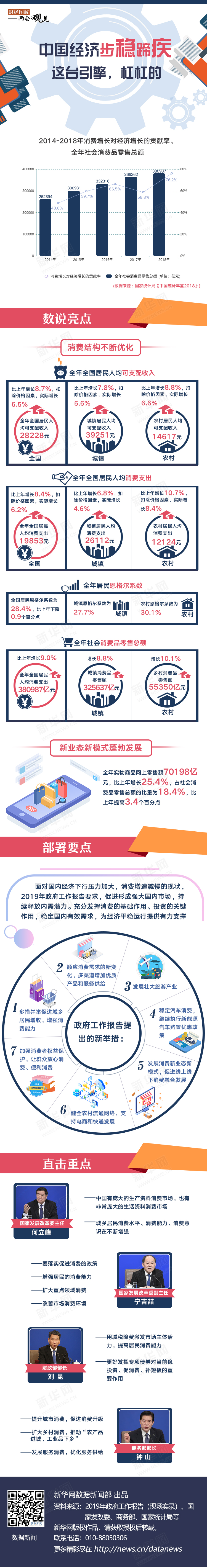 新華網北京3月9日電(劉緒堯 何凡) 2018年消費的增長對經濟增長的貢獻達到76.2%,已連續(xù)五年成為拉動經濟增長的主引擎,消費結構不斷優(yōu)化,教育、文化、娛樂、醫(yī)療保健等服務消費支出比例穩(wěn)步提高。當前,我國整個國民經濟13.6萬億美元的總量當中,消費總量已超過8萬億美元。未來如何更充分地發(fā)揮消費的基礎作用?且看政府工作報告如何部署。