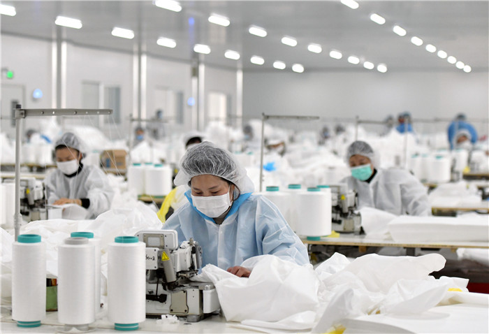 1月28日,在武漢市新洲區(qū)武漢協(xié)卓衛(wèi)生用品有限公司,工人在趕制防護服,該公司是生產(chǎn)手術服、防護服等產(chǎn)品的企業(yè)。 新華社記者 才揚 攝