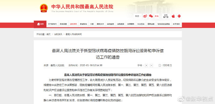 最高人民法院30日發(fā)布通告,即日起,最高人民法院本部、第一、第二、第三、第四、第五、第六巡回法庭和知識(shí)產(chǎn)權(quán)法庭訴訟服務(wù)和群眾來(lái)訪接待場(chǎng)所暫時(shí)關(guān)閉,恢復(fù)接待時(shí)間視疫情形勢(shì)變化另行通知;當(dāng)事人需要提交申請(qǐng)?jiān)賹彶牧?、申訴信訪或者申請(qǐng)其他訴訟服務(wù)事項(xiàng)的,請(qǐng)通過(guò)最高人民法院訴訟服務(wù)網(wǎng)或者郵寄方式提交,查詢(xún)咨詢(xún)事項(xiàng)可撥打12368訴訟服務(wù)熱線聯(lián)系辦理。(記者羅沙)?