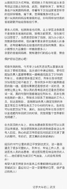 “經(jīng)歷約1872公里的我已平安到達武漢,這一路我遇見了很多可愛的人,列車長、車站工作人員……他們都在為武漢打氣加油,人間自有真情在!”1月26日,白衣天使郎冰凝在自己的手機里敲出了一段動人的文字,文字的背后是鐵路人傾情護送她奔赴武漢的暖心故事。