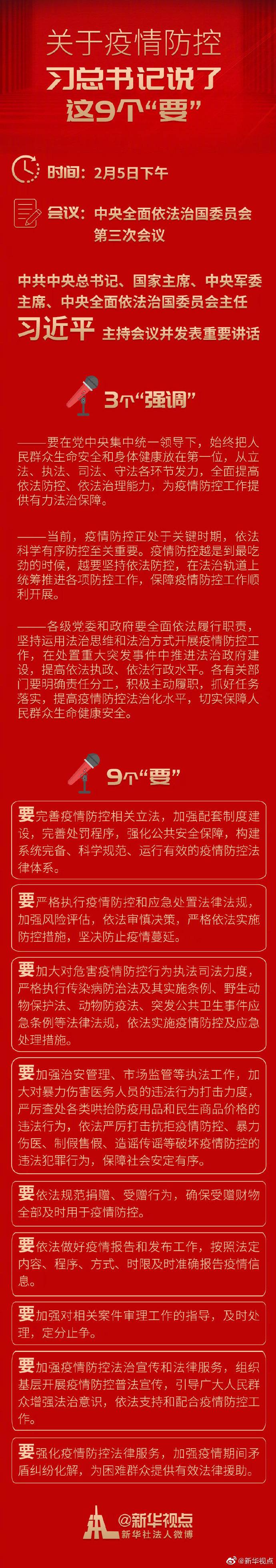 2月5日下午,中共中央總書記、國(guó)家主席、中央軍委主席、中央全面依法治國(guó)委員會(huì)主任習(xí)近平主持召開中央全面依法治國(guó)委員會(huì)第三次會(huì)議強(qiáng)調(diào),全面提高依法防控依法治理能力,為疫情防控提供有力法治保障。