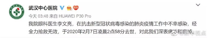 據(jù)@武漢中心醫(yī)院消息:武漢中心醫(yī)院眼科醫(yī)生李文亮,在抗擊新型冠狀病毒感染的肺炎疫情工作中不幸感染,經(jīng)全力搶救無效,于2020年2月7日凌晨2點(diǎn)58分去世,對(duì)此,醫(yī)院方面深表痛惜和哀悼。