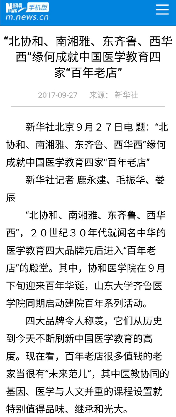 新華社有篇報(bào)道把它們稱為中國醫(yī)學(xué)教育四家“百年老店”,是20世紀(jì)30年代就聞名中華的醫(yī)學(xué)教育四大品牌。它們從歷史到今天不斷刷新中國醫(yī)學(xué)教育的高度?!?/p>