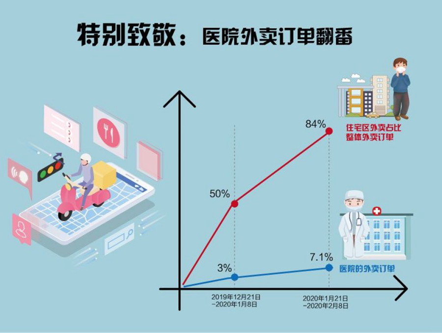 “餓了么”數(shù)據(jù)顯示,自疫情爆發(fā)以來,醫(yī)院的外賣訂單占比上升了一倍,加班加點,外賣訂單猛增,讓我們向戰(zhàn)斗在一線的醫(yī)務(wù)工作者致敬!
