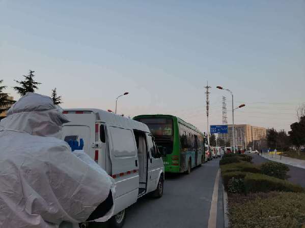 各個街道轉(zhuǎn)運病人的車輛排成長龍