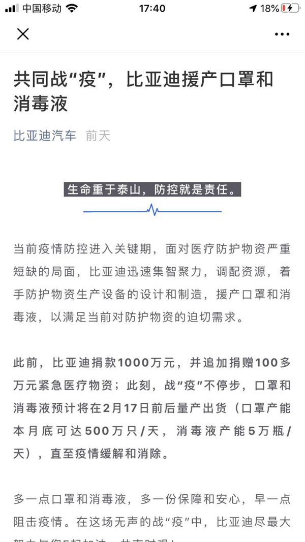 2月8日,“比亞迪汽車(chē)”微信號(hào)一篇《共同戰(zhàn)“疫”,比亞迪援產(chǎn)口罩和消毒液》引發(fā)網(wǎng)友關(guān)注,文章稱(chēng),比亞迪將在2月17日前后預(yù)計(jì)量產(chǎn)出貨口罩和消毒液(口罩產(chǎn)能本月底可達(dá)500萬(wàn)只/天,消毒液產(chǎn)能5萬(wàn)瓶/天),直至疫情緩解和消除。