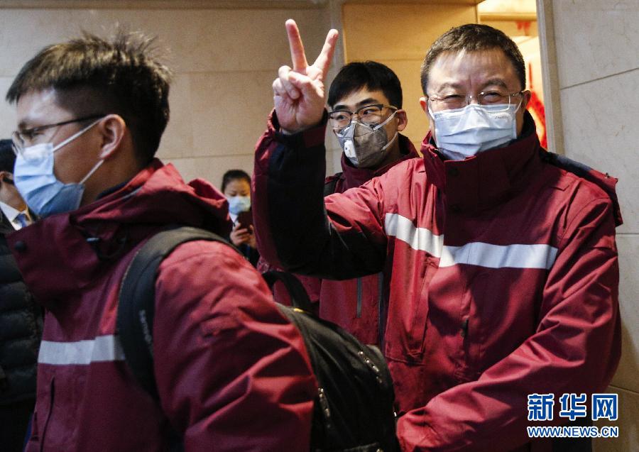 2月1日,中日友好醫(yī)院黨委書記周軍(右一)在出發(fā)前做出勝利的手勢(shì)。當(dāng)日,為進(jìn)一步加強(qiáng)武漢新型冠狀病毒感染的肺炎危重癥患者救治工作,國(guó)家衛(wèi)生健康委緊急組派中日友好醫(yī)院、北京大學(xué)第一醫(yī)院、北京大學(xué)人民醫(yī)院、北京大學(xué)第三醫(yī)院院長(zhǎng)或書記帶領(lǐng)本院重癥醫(yī)學(xué)科主任、護(hù)士長(zhǎng)等專業(yè)人員奔赴武漢,和前期組派的專業(yè)醫(yī)務(wù)人員一起開(kāi)展危重癥患者救治工作。 新華社記者 張玉薇 攝