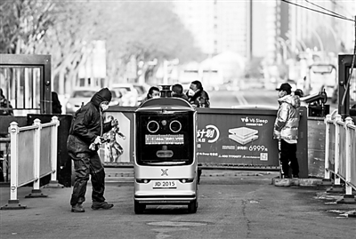 2月7日,京東物流的智能配送機(jī)器人進(jìn)入呼和浩特市的一個(gè)封閉管理小區(qū),為居民配送快遞。新華社發(fā)