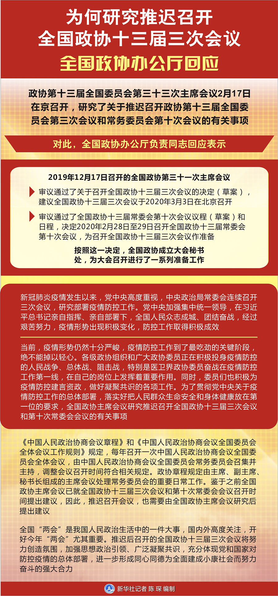 新華社北京2月17日電 政協(xié)第十三屆全國委員會第三十三次主席會議17日在京召開,研究了關(guān)于推遲召開政協(xié)第十三屆全國委員會第三次會議和常務(wù)委員會第十次會議的有關(guān)事項。對此,全國政協(xié)辦公廳負責(zé)同志回應(yīng)表示,2019年12月17日召開的全國政協(xié)第三十一次主席會議,審議通過了關(guān)于召開全國政協(xié)十三屆三次會議的決定(草案),建議全國政協(xié)十三屆三次會議于2020年3月3日在北京召開;審議通過了全國政協(xié)十三屆常委會第十次會議議程(草案)和日程,決定2020年2月28日至29日召開全國政協(xié)十三屆常委會第十次會議,為召開全國政協(xié)十三屆三次會議作準(zhǔn)備。按照這一決定,全國政協(xié)成立大會秘書處,為大會召開進行了一系列準(zhǔn)備工作。