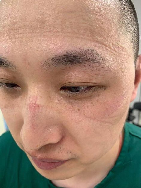 朱瑞臉上被壓出的印記。(福州市團(tuán)委供圖)