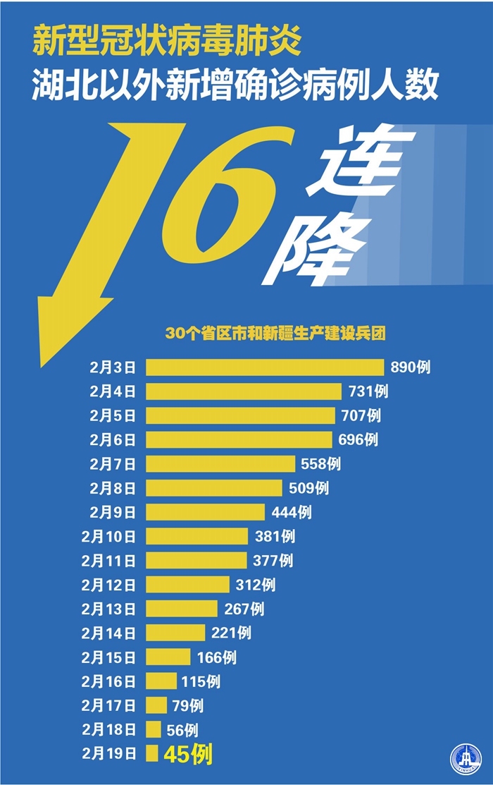 截至2月19日24時,據(jù)31個?。ㄗ灾螀^(qū)、直轄市)和新疆生產建設兵團報告,現(xiàn)有確診病例56303例(其中重癥病例11864例),累計治愈出院病例16155例,累計死亡病例2118例,累計報告確診病例74576例(江西、河南、云南省各核減1例),現(xiàn)有疑似病例4922例。累計追蹤到密切接觸者589163人,尚在醫(yī)學觀察的密切接觸者126363人。