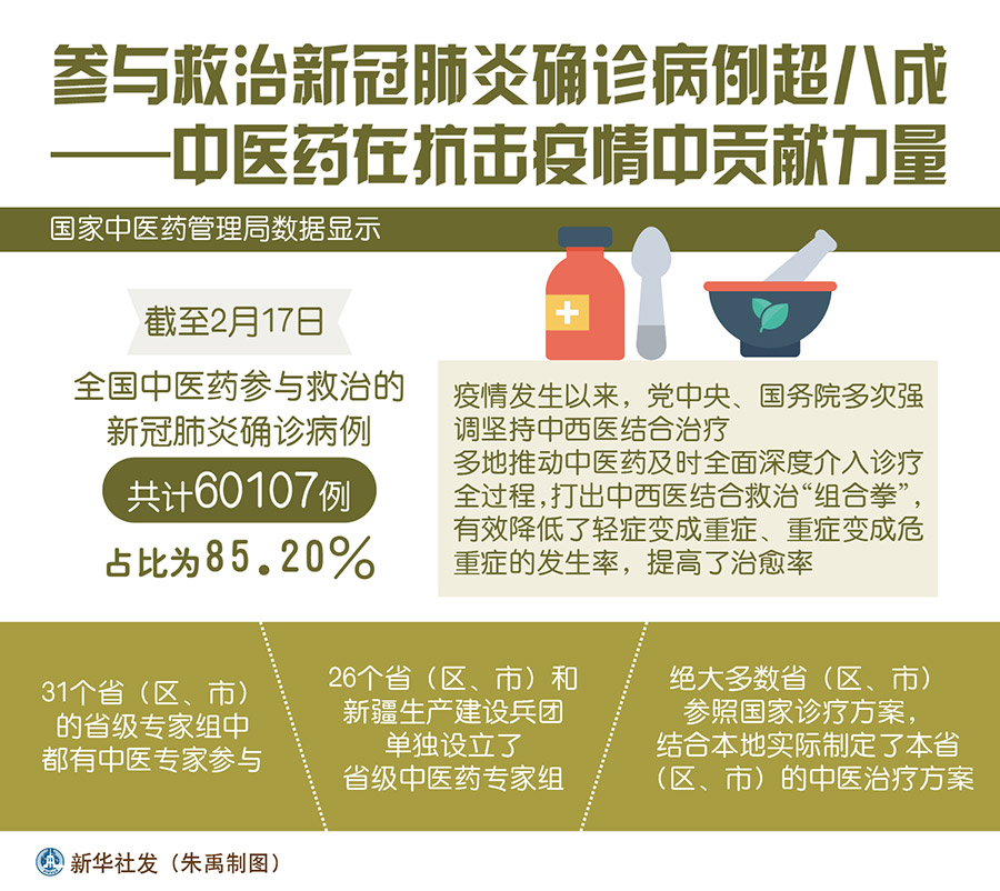 國家中醫(yī)藥管理局數(shù)據(jù)顯示,截至2月17日,全國中醫(yī)藥參與救治的新冠肺炎確診病例共計60107例,占比為85.20%。疫情發(fā)生以來,黨中央、國務院多次強調堅持中西醫(yī)結合治療。多地推動中醫(yī)藥及時全面深度介入診療全過程,打出中西醫(yī)結合救治“組合拳”,有效降低了輕癥變成重癥、重癥變成危重癥的發(fā)生率,提高了治愈率。