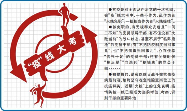 這次抗擊新冠肺炎疫情,是對(duì)全面從嚴(yán)治黨的一次檢閱,是領(lǐng)導(dǎo)干部政治素質(zhì)、宗旨意識(shí)、全局觀念、駕馭能力、擔(dān)當(dāng)精神的試金石、磨刀石?;鶎邮菆?zhí)政之基。“能者上、庸者下、劣者汰”,近期“火線”上的任免表明,疫情防控一線已經(jīng)成為當(dāng)前考驗(yàn)、考察、識(shí)別干部的重要陣地。(案例來(lái)源:新華社、中央紀(jì)委國(guó)家監(jiān)委網(wǎng)站、中國(guó)紀(jì)檢監(jiān)察報(bào)、湖北日?qǐng)?bào)等 記者黃海波、劉婧宇)