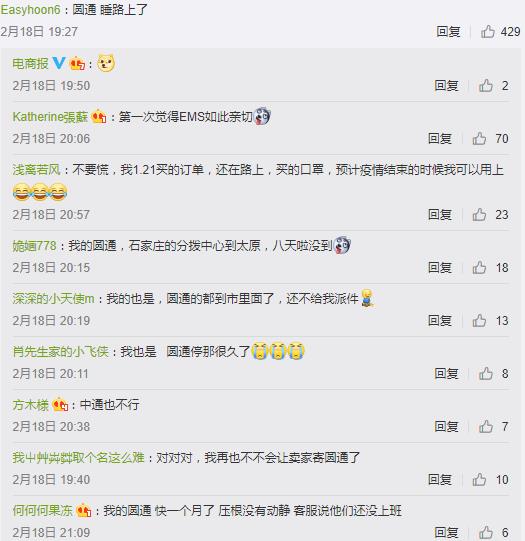 網(wǎng)友“滿杯甜酒椰”發(fā)布微博稱,“我十天沒(méi)動(dòng)的韻達(dá)是不是可以更新一下物流惹”;網(wǎng)友“啵霸兔兔果茶”說(shuō),“圓通快遞怕是消失了,送個(gè)東西幾天不動(dòng)一下”;網(wǎng)友“啊啊啊喵在等待”則調(diào)侃,“等中通快遞把我的口罩寄到了,疫情也快結(jié)束了吧”。