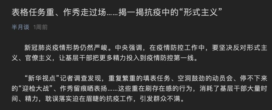 西部省份一位宣傳部門負責(zé)人告訴半月談記者,他們縣成立了疫情指揮部,并下設(shè)不同組,但組與組之間缺乏溝通,實際上仍然各自為政。“就拿防疫與檢測工作來講,指揮部統(tǒng)一安排后,其他部門依然安排本部門、本行業(yè)的防疫及檢測?;鶎尤耸直揪筒粔?,各部門再各吹各的號,就更亂了。”