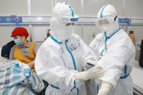 雷神山醫(yī)院內(nèi)患者告訴護士飲食禁忌,由于沒有紙護士就記錄在衣服上