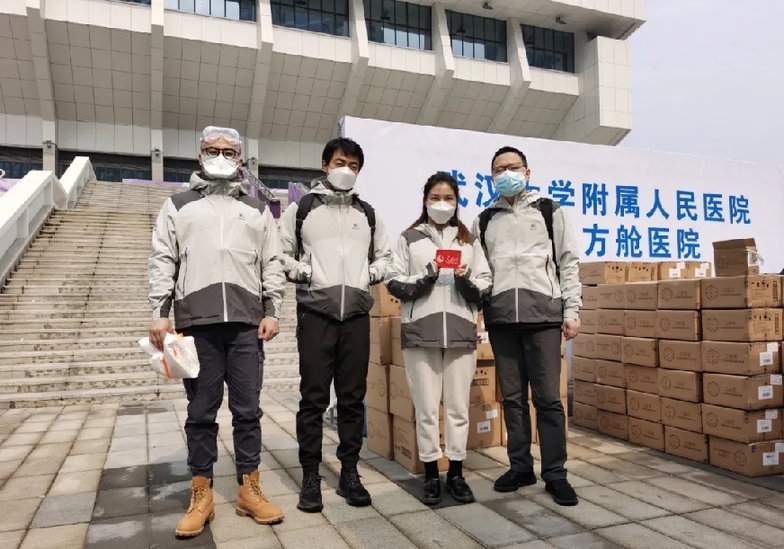 2月21日,人民網(wǎng)記者進(jìn)入洪山體育館武昌方艙醫(yī)院采訪(fǎng)前合影。右二為記者張嬋。