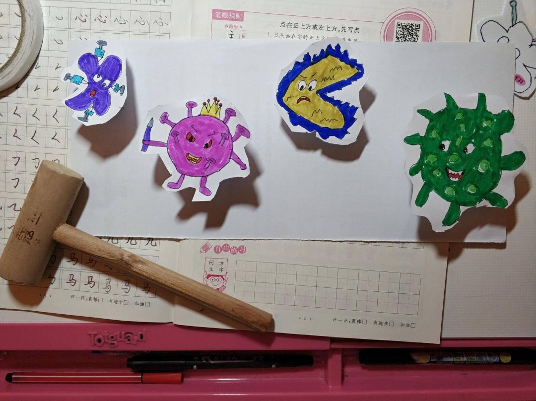 這是我女兒畫(huà)的,病毒下面粘了彈簧,病毒一出來(lái),她就用錘子使勁兒捶。