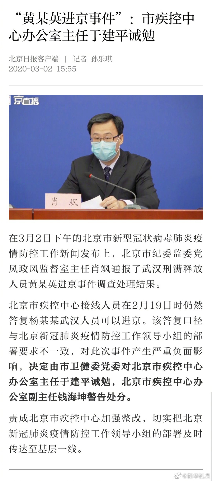 “黃某英進(jìn)京事件”:北京市疾控中心辦公室主任于建平誡勉-新華網(wǎng)