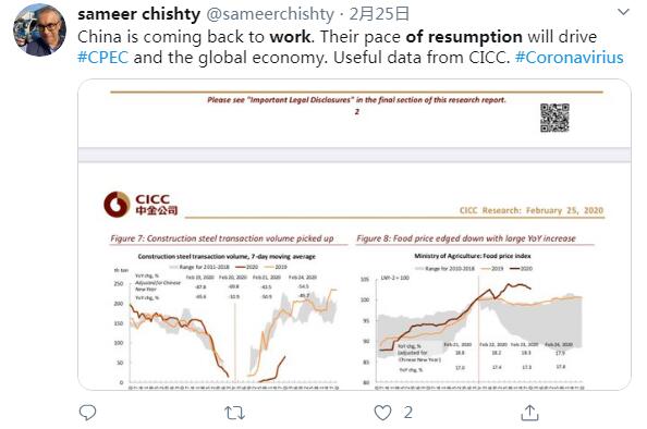 推特用戶sameer chishty說:中國正在復工復產(chǎn)。他們的這一步伐將驅(qū)動全球經(jīng)濟增長。