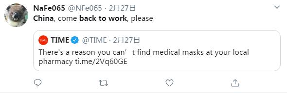推特用戶NaFe065說:中國趕緊復工復產(chǎn)吧,拜托了。