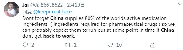 推特用戶Jai說:不要忘了中國供應(yīng)著全世界80%的活性藥物成分,因此如果中國不復工復產(chǎn),它們可能會在某個時間點用完。