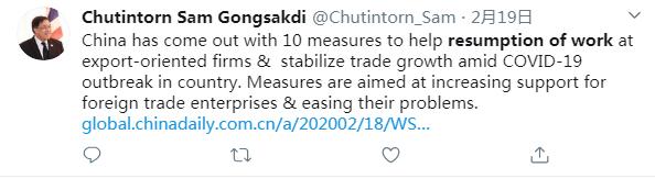 推特用戶Chutintorn Sam Gongsakdi說:在應(yīng)對新冠肺炎疫情期間,中國出臺了10項措施來幫助出口企業(yè)復工復產(chǎn),并推動貿(mào)易的穩(wěn)定增長。這些措施旨在加強對外貿(mào)企業(yè)的支持,并解決它們面臨的問題。