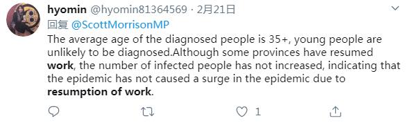 推特用戶hyomin說,一些省份已經(jīng)復工,不過受感染的人數(shù)沒有隨之增加,這表明復工復產(chǎn)沒有導致更多感染病例。
